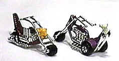 In 1973, Matchbox intended to release 6 different "Chopper" motorcycles. Only 3 were released: (1) Stingeroo three-wheeler; and (2) Chop Suey; and (3) Jumbo Jet, two-wheelers. The handlebar/front fork assemblies were all supposed to be chrome plated, but during production the chrome plating chipped off the plastic easily, so the models were formally released with handlebar/fork assemblies in molded colors. The chromed handlebar models are the hardest to find as very few were released to the stores. The common handlebar color for the Stingeroo is purple and the less common is Light Blue. The common color of the handlebar for the Chop Suey is red while the more difficult colors are black or red-orange.