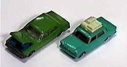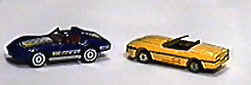 The Dark Blue Corvette T-top shown with "Superfast" low-friction multi-spoke wheels that are not normally found with this model, found by Charlie Mack in a Bradley's Department Store. The Yellow Corvette is a pre-production model found by Charlie Mack in a Blister Pack in a Child World Toy Store. The model includes smaller older wheels not usually found on this model, glued together rivet points on the base, and a rearview mirror that was painted on by hand.