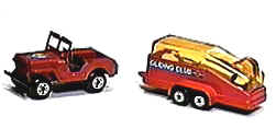 Rare two-pack release TP-7 Jeep and Glider Trailer in Red found in Holland in 1977. The common issue of this two-pack is yellow but the red releases seem to have been only found for a very limited time in Holland. The transparent "glass" on the trailer is amber colored.
