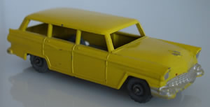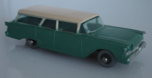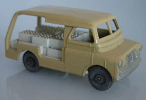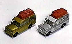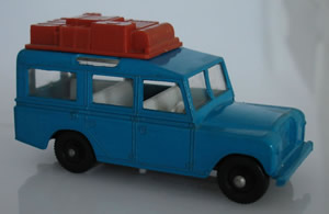 The 12-C long wheel-base Series II, Land Rover was first released in 1965 in a dark green (a much more realistic choice than later versions) with brown luggage on the roof. This model already signaled some of Lesney's cost-cutting efforts as the base was no longer die-cast, but black plastic. The light blue-green with either brown or tan luggage that followed is most common version.