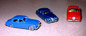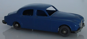 65A Jaguar 3.8 Sedan, enamel blue (left), metallic blue version (center), and 65B non-metallic red (right) [photo from John Dean's collection]