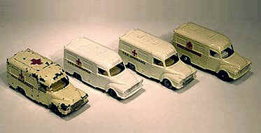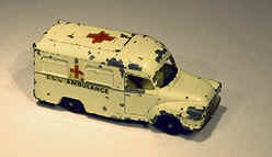 Rare 14-C Lomas Ambulance with knobby black plastic wheels, ivory interior, red cross decal guides on the roof, and the roof-decal in place! Found in a junky box-lot at the Lloyd Ralston auction in June, 1996.