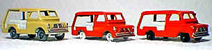 The Matchbox VW van (the 34A Volkswagen 15 cwt Van, left) is probably too wide to be accurate, while the Dublo (produced in '60-'64, rightmost in the right photo) is more true to the proportions of the real vehicle, which just goes to support that an exact scale model will not look right. If you ever looked down on an automobile from a tall building you will see a shape that is much longer than it is wide. We never see from that perspective because if we see the front & the side we are seeing a 3/4 view. So the art of the model maker is to distort the toy so it looks right to they eye. Exact proportions are no refuge.