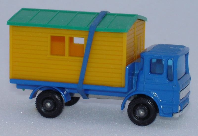 1. blue body, yellow plastic hut with green roof, black plastic wheels