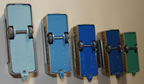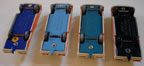 1. yellow & turquoise body, no windows, gray plastic wheels